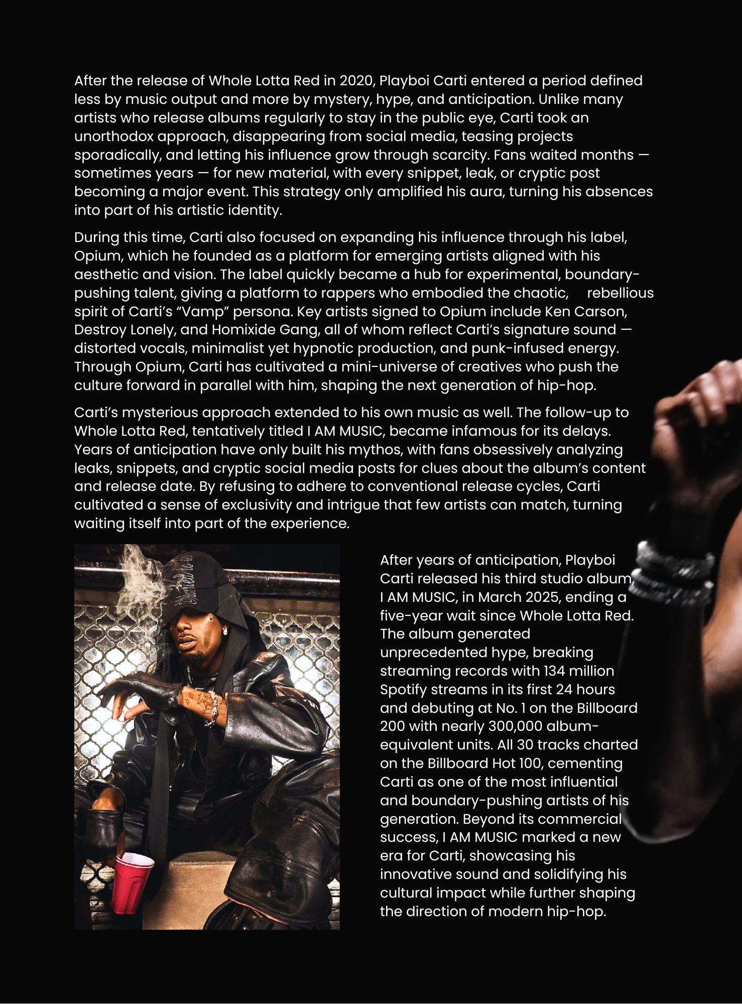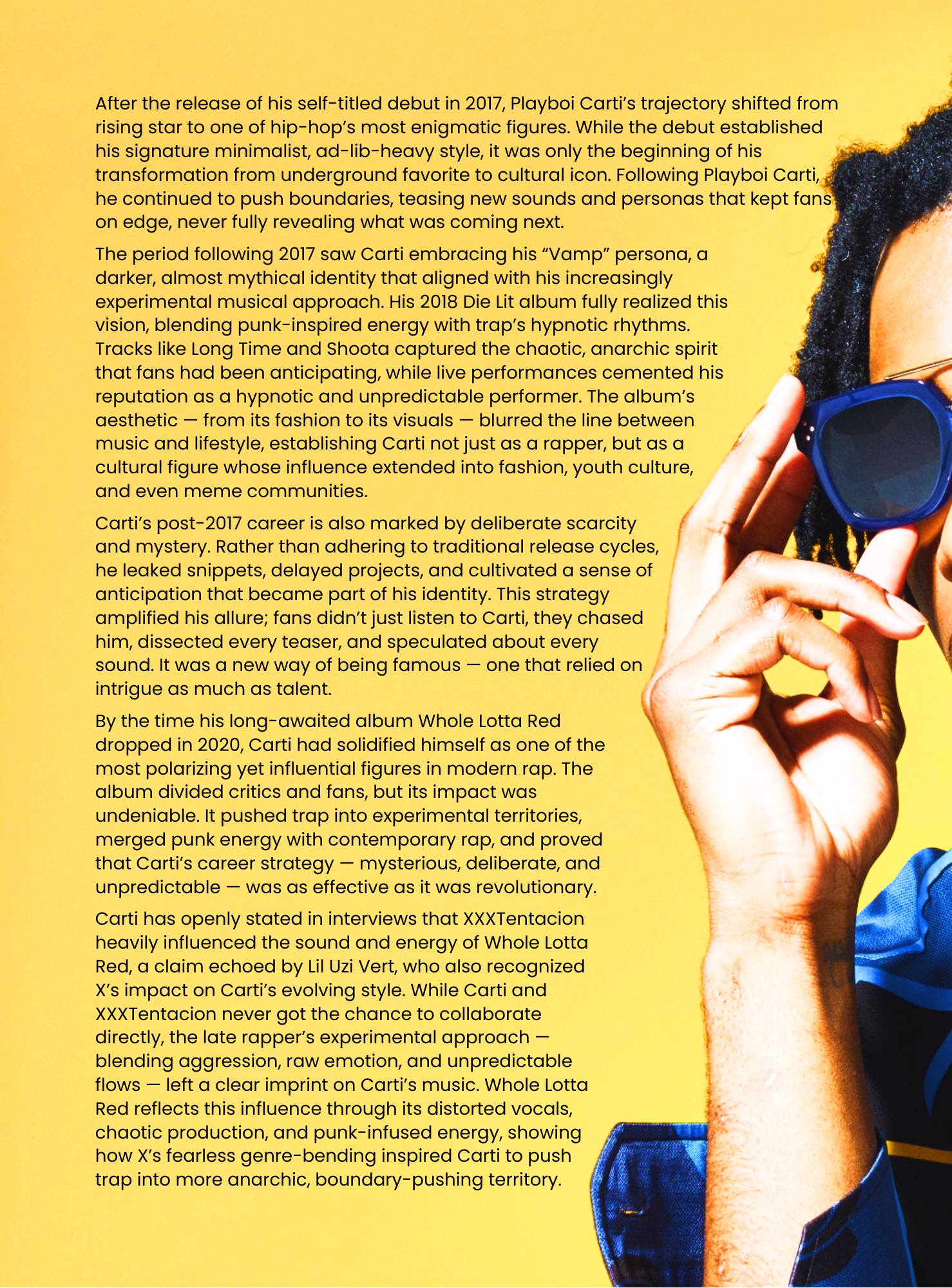 The Rise of Playboi Carti takes you through Carti’s rise... from his early days to becoming one of rap’s most influential trendsetters. This magazine highlights the key moments, style shifts, and cultural impact that shaped his journey and the movement around him.